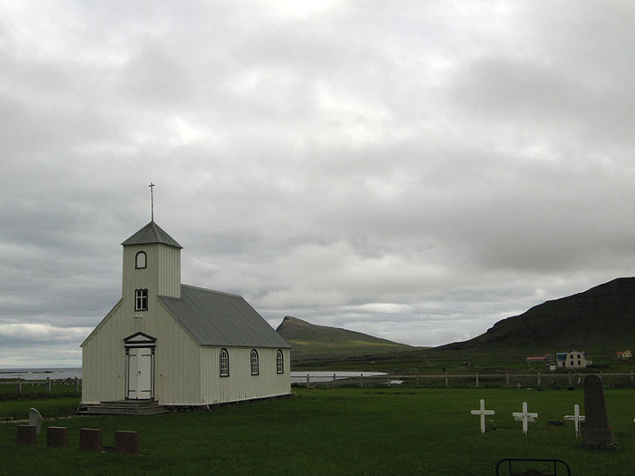 Norðurfjörður. Die alte Kirche, mit dem Friedhof.