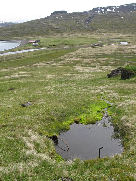Entfernt: Sommerhaus Reykjarfjörður. Vorne: die Wasser-"quelle".