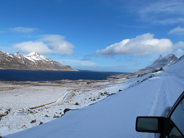 Blue sky and sunshine. Driving home, but we had to drive back to Djúpavík because the road was not passable of too much snow some kilometer later.